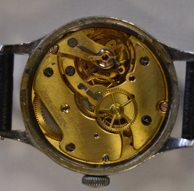A gentlemans vintage JAEGER LE COULTRE wristwatch having a circular steel dial with coloured faceted hands, serial, No.325054 set to a later leather strap, original brown leather strap (af) included