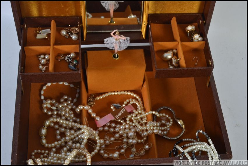 A large silk lined musical jewellery box containing a good selection of costume jewellery to include earings bracelets and necklaces
