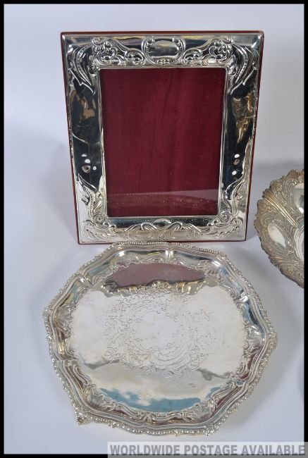 A collection of assorted silver plated items etc to include 3x plated dishes, inkwell etc. frame 33cmH