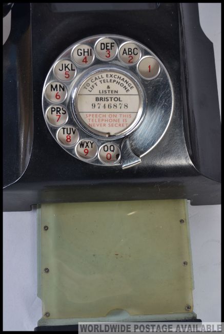 A vintage mid 20th century bakelite ring dial telephone complete with it's cheese tray, along with a 1970's / 1980's ring dial telephone finished in cream