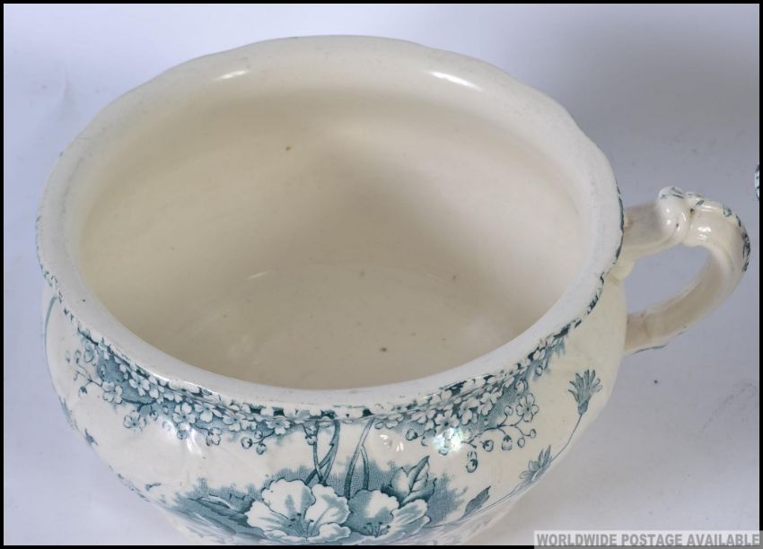 A late 19th early 20th Staffordshire wash bowl and matching jug set along with a bed pan, stamped to the base Sandown Stone Pottery