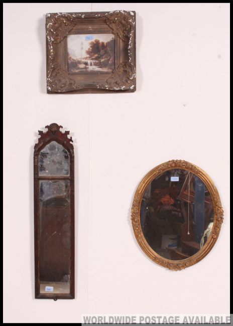 A Victorian wall mirror of arched form together with a gilt framed oval mirror and a print in gesso style oversized frame Measure: 91 x 20.