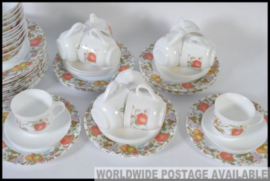 A retro Pyrex style part dinner service consisting of plates, cups and bowls marked to the base Acropal France