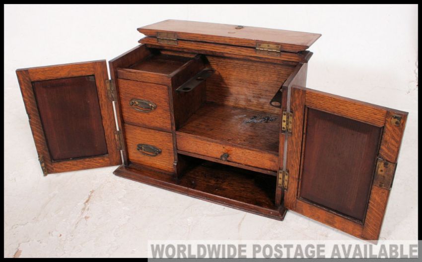 An early Victorian arts and crafts smokers cabinet with handles to sides. Beautiful double door frontage with embossed copper art nouveau style. Fitted interior with 2 square drawers plus one other.