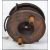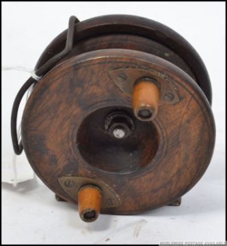An vintage Allcock 4" wood and brass reel with makers mark stamped onto the brass foot and with two wooden handles