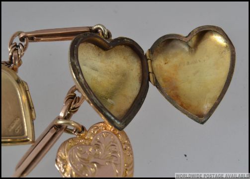 An interesting collection of 10 9ct gold heart lockets strung upon a 9ct gold watch chain one set with turquoise another with a diamond and some with etched decoration. Some marked 9ct front and back others hallmarked 9ct. Total weight 45g.