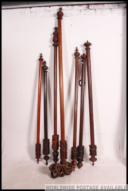 A collection of Victorian mahogany large curtain rails of think form being well carved with finial ends ( 7 total )