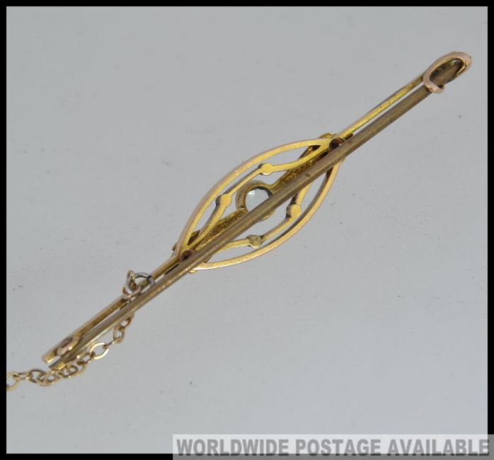 A 9ct gold seed pearl and clear stone set ladies bar brooch with pin and chain. Unmarked, tests as 9ct. Total weight 3.2g