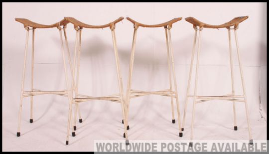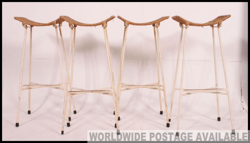 A set of 4 retro mid century rattan weave metal bar stools. The painted metal frames with shaped rattan seats atop