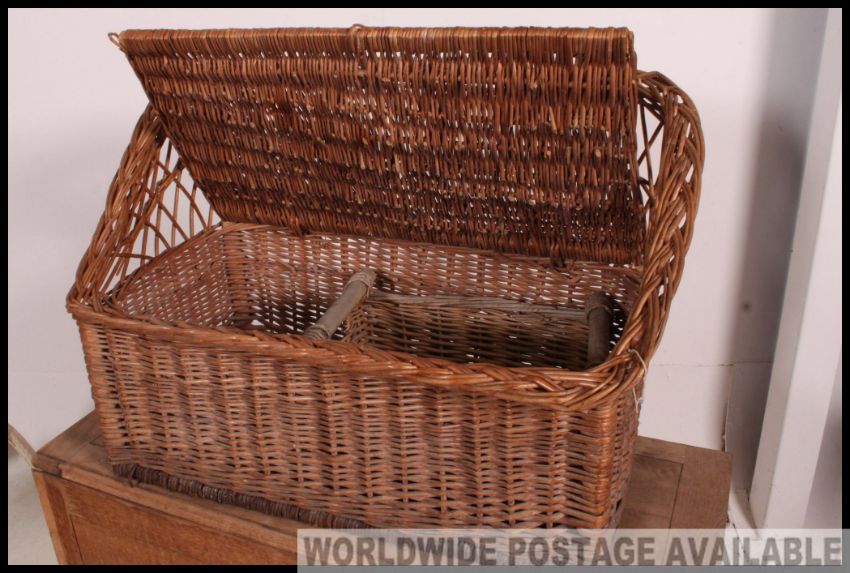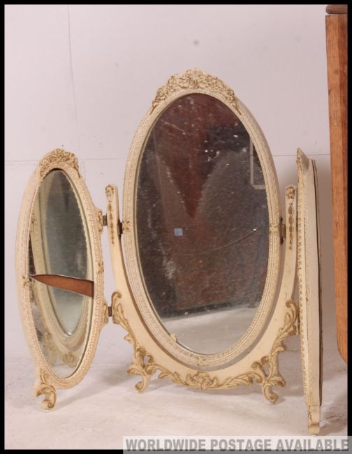 An unusual dolls sized large whicker weave hall settle with hinged seat together with another basket, drop leaf table and white triple dressing mirror