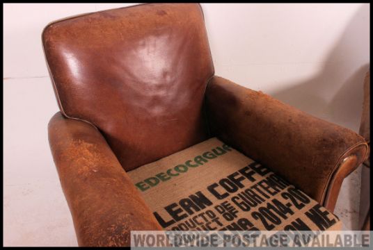 A fantastic pair of 1930's vintage leather club arm chairs, both chairs having a unique Hessian sack cushion pads Measures: 80 x 95 x 92.
