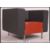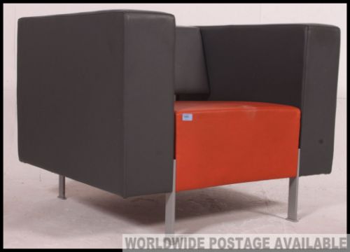 A great vintage retro orange and grey vinyl armchair on powder coated metal legs, with a wedge shaped back rest. By Kinnarps of Sweden.