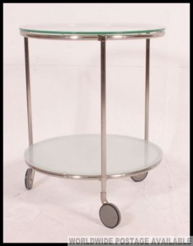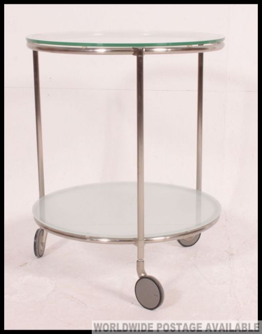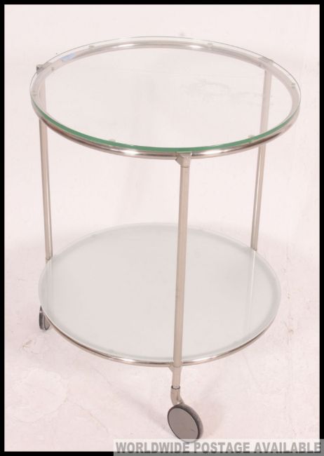 A vintage mid century chrome and glass two tier occasional table on castors, being constructed from a tubular metal chrome body, with two circular drop in glass shelves. Measures: 62 x 52.