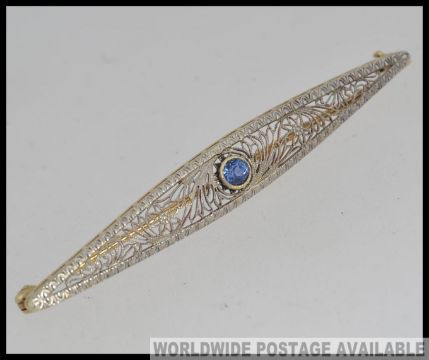 A 14ct gold and silver filigree bar brooch with inset blue round cut sapphire. Stamped 14k. Total weight 3.7g