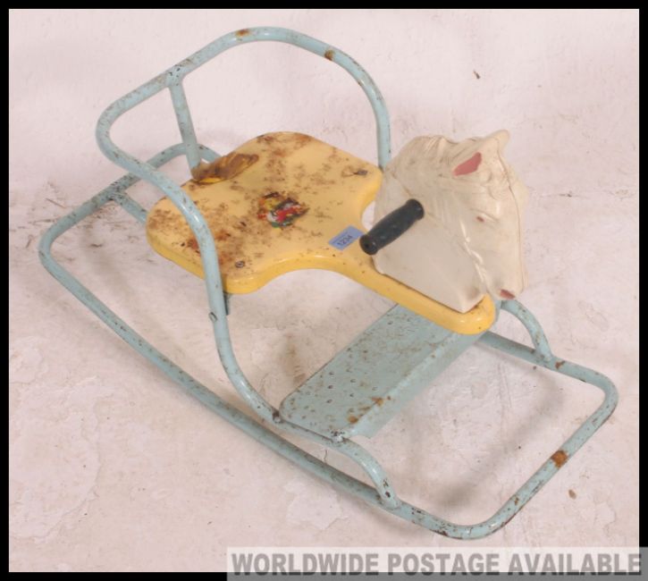 An original vintage Triang rocking horse, of tubular metal form with a cream plastic seat.