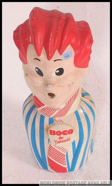 BOCO THE BALLOONIST: An original vintage shop display ' Boco The Balloonist ' mascot. In the form of a man, this would've slipped over the top of a helium bottle used to inflate balloons. Plastic construction, with coloured features and notation to front. Unusual.
