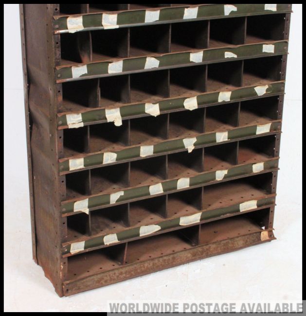 An original mid 20th century Industrial large green painted enamel metal sectional cubby cabinet, pigeon hole. The cabinets each having shelves with adjustable sectional dividers. Having painted notation no's etc to sides. Ex Douglas motorcycle Factory. H193cm x W92cm x D33cm