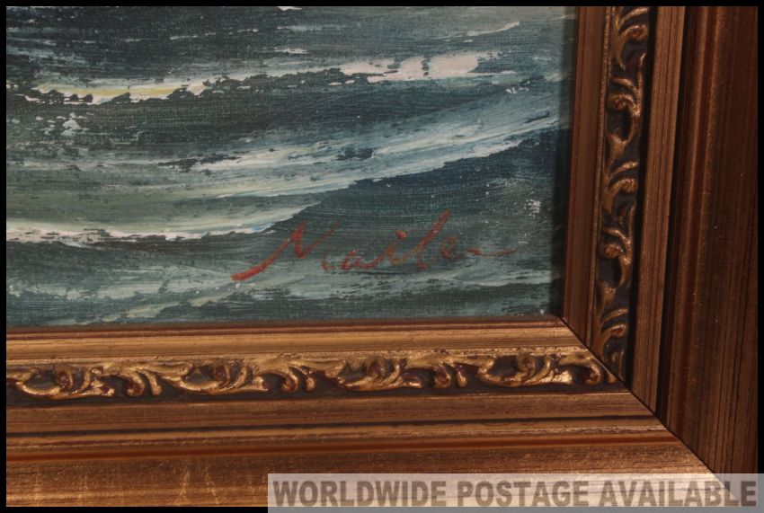 A framed oil on canvas of a of a coastal scene with a tall ship with full sails down, signed to the bottom left hand corner Mailer.