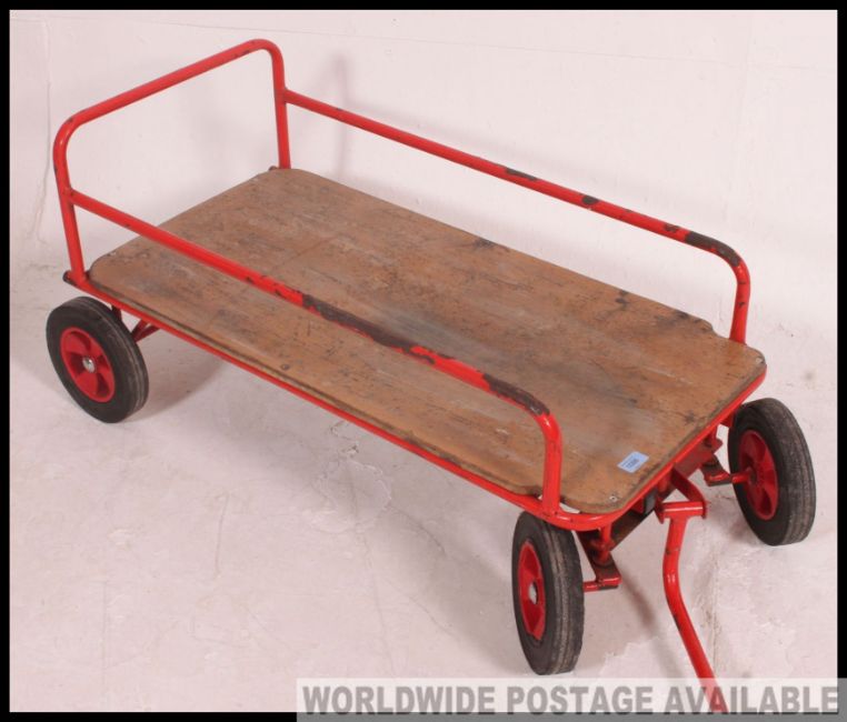A stunning retro pull along Trolley of red painted tubular construction, with a wooden base, ideal conversion to a coffee table Measures: 49 x 108 x 47.