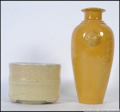A Chinese monochrome yellow vase adorned with fu-dog masks and incised decoration of dragons and clouds. The underside with 6 blue character marks H22cm