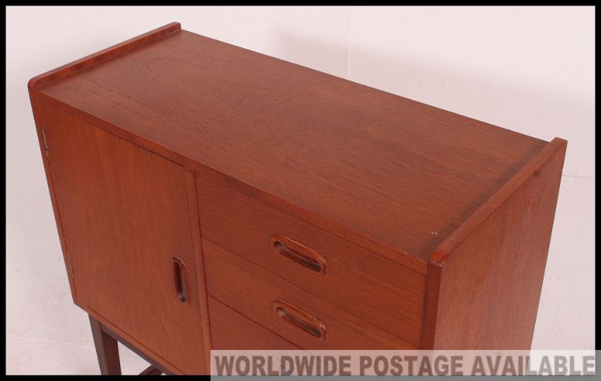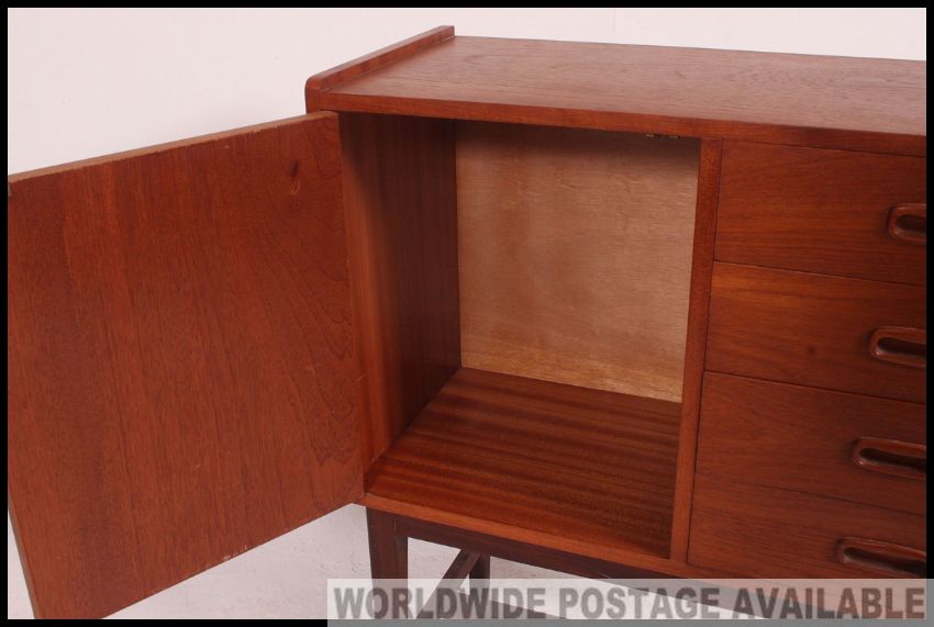 A good 1970's retro teak wood Danish influence side cabinet chest of angular form raised on tapered legs having sectional body with drawers. Measures: 84 x 73 x 31.