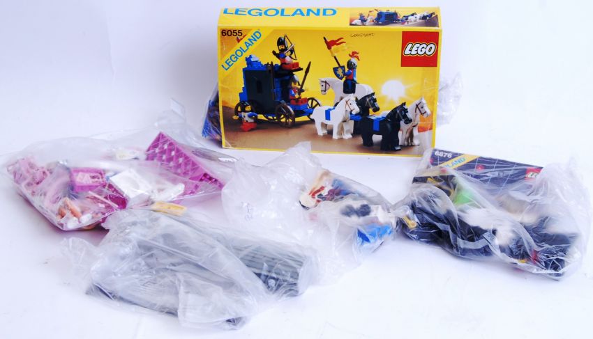 LEGO: A collection of vintage Lego to include: Knights Prisoner Convoy 6055 with original slipcase box, the box marked 'complete' with the contents bagged, along with 4x other small vintage bagged sets (unchecked).