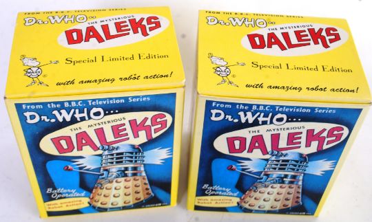 DOCTOR WHO: Two Marx / Dapol reissue limited edition battery operated Daleks. Both within the original boxes. Appear unused and complete. Red and black variations. Untested.
