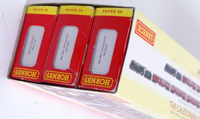 HORNBY CALEDONIAN COACHES: A boxed collection set of Hornby 00 gauge railway trainset ' Caledonian Carriages ' R41771 Coach Pack. Appears complete and unused within the original display sleeve.