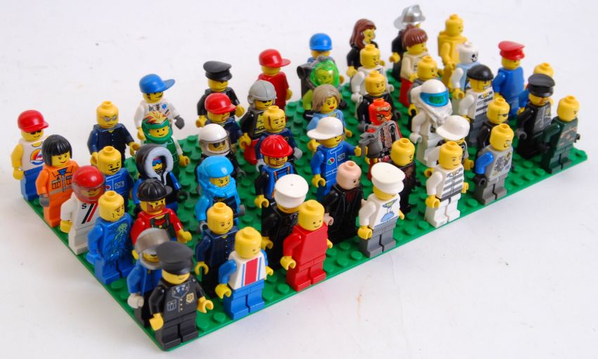 LEGO: A collection of 50x assorted Lego minifigures to include: vintage, Town, City, Arctic, etc. All mounted on a Lego base plate.