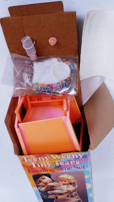 TINY TEARS; A rare original Palitoy made ' Teeny Weeny Tiny Tears Feeding Time Set ' for a Palitoy doll. Appears unused, within the original box. With internal packaging.
