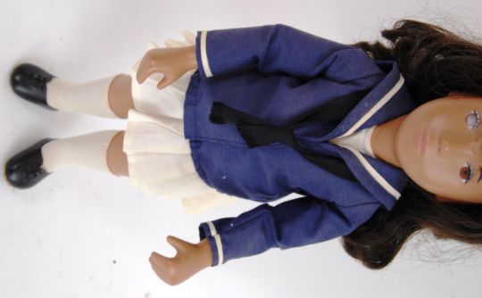 SASHA DOLL: An original vintage 1960's Sasha Doll. Dark hair, blue top with neck tie, straw hat and a white skirt. Complete with socks and shoes. Approx 40cm tall. Sasha dolls are a type and series of doll created by Swiss artist and dollmaker Sasha Morgenthaler (1893-1975), produced in Germany and the United Kingdom beginning in the late 1960s. Popular with collectors, Sasha dolls are characterized by their individualism, their realistic expressions, their unique colour, and the extreme attention to detail in the manufacture of the dolls as well as their clothes.