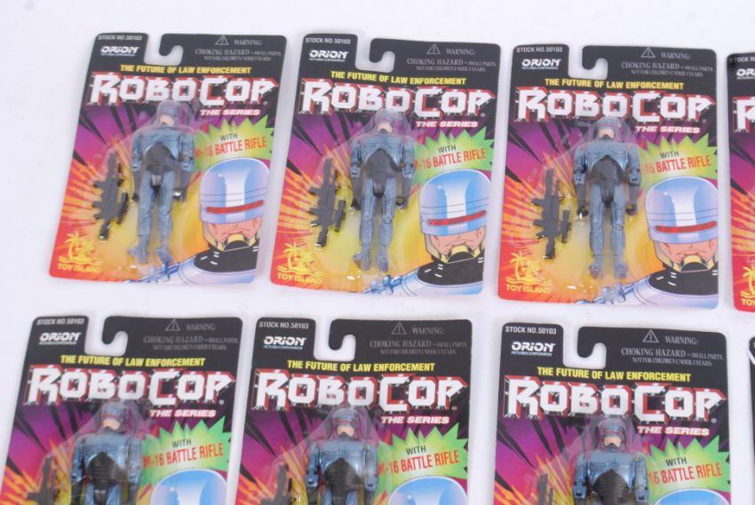 ROBOCOP: A collection of 14x vintage Orion licensed Toy Island Robocop carded action figures. Each the same, unused, sealed on original card backs.