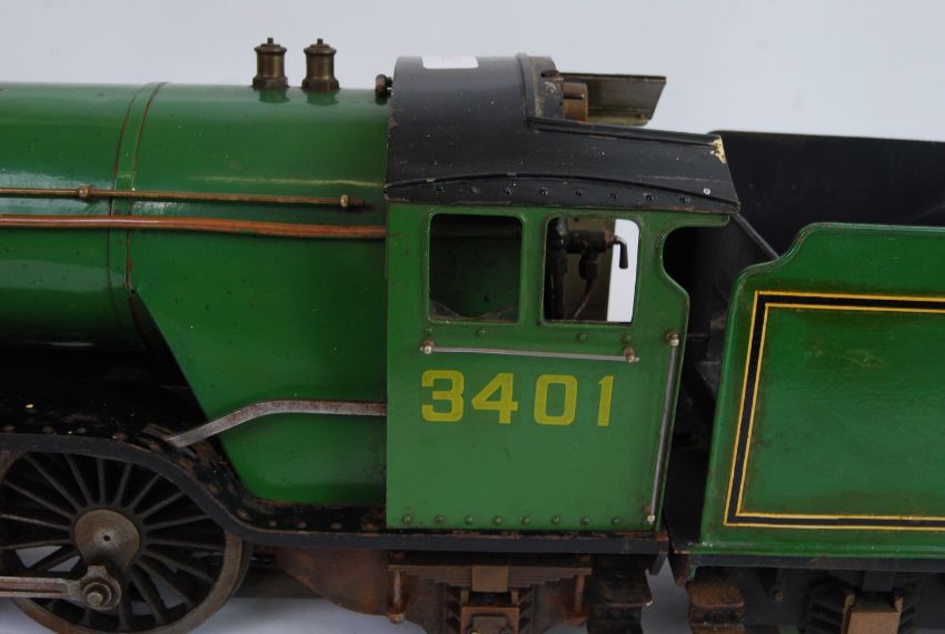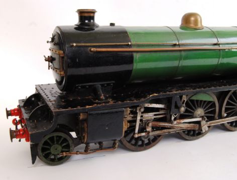RARE LIVE STEAM 3 1/2" GAUGE BANTAM COCK: A fabulous 3.5" gauge live steam Bantam Cock and matching tender steam train locomotive. Fitted with a 21" Stuart boiler and painted in LNER green. A Stuart pressure gauge is fitted, and all the pipes and couplings etc appear complete. According to the vendor, this train used to be used on the Aston Court estate miniature railway some years ago. Length of train and tender approx 114cm. Untouched since its last use some years ago, it is highly likely that this requires very little attention to run once again, although, of course, no guarantees are given or implied.