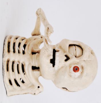 MONEY BOX: A 20th century cast iron hand painted halloween style money box in the form of a skull. With moving hand, the coin slot being an opening eye.