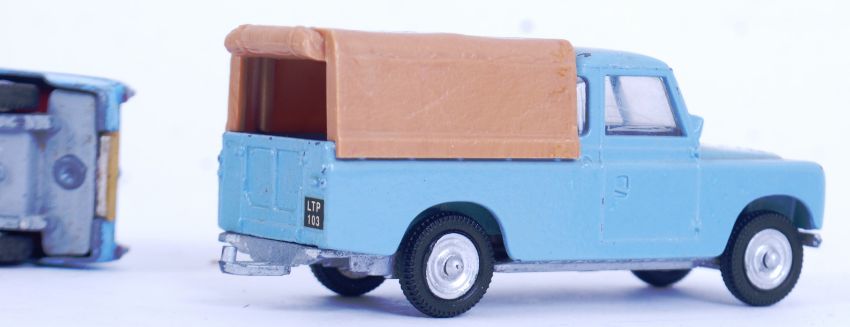 SPOT ON: A collection of 4x Spot On diecast model cars - Consul Classic, Bedford 15cwt Van (stamped Made In Northern Ireland), LWB Land Rover (with cover) and a Ford Anglia Saloon. Along with another. Mostly in playworn, but good condition.