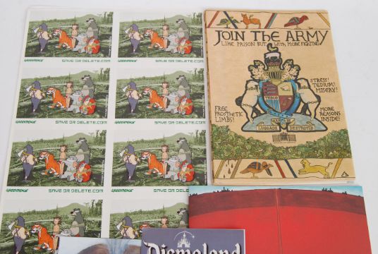 DISMALAND MISC: A collection of assorted Banksy / Dismaland miscellany, comprising of: an original Banksy Versus Bristol Museum leaflet, ' Below ' book by Darren Cullen, ' Join The Army ' by Darren Cullen (folding pamphlet story), a print of Monkey Parliament by Banksy, original set of Banksy Greenpeace ' Save Or Delete ' stickers and an original Dismaland leaflet etc NOTE: From a private collection of Dismaland / Banksy and related items. Some of which were obtained directly from Dismaland, or directly from the artist(s) associated. Where something is listed as possibly Banksy buyers are reminded to satisfy themselves as to originality, condition and authenticity, and no artwork comes with authentication or any guarantee implied or given. Provenance, where given, is there for reference or guide only. The vendor will be donating an amount of the proceeds raised in this sale to a local Bristol homeless charity.