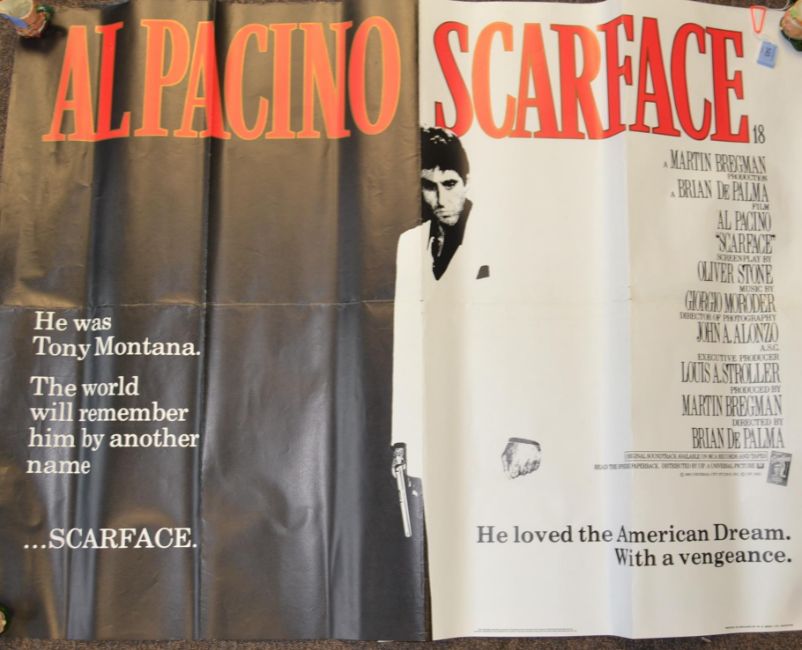 SCARFACE: An original cinema quad advertising poster for the Al Pacino classic movie Scarface. Depicting Pacino to the left hand third, with bold text and notation. Unframed