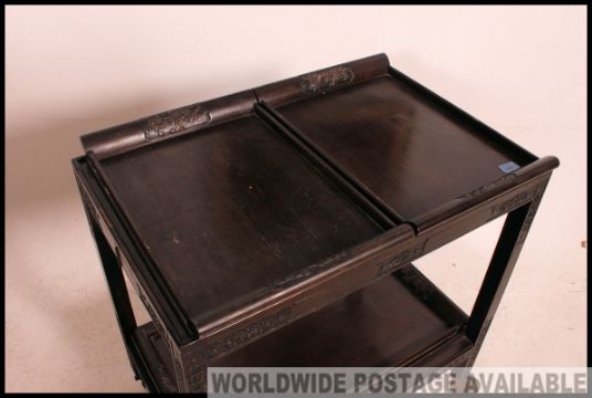 A Chinese metamorphic hardwood mid century butlery serving trolley. The trolley which folds down having twin tiers with 3 removeable trays, all on castors to base