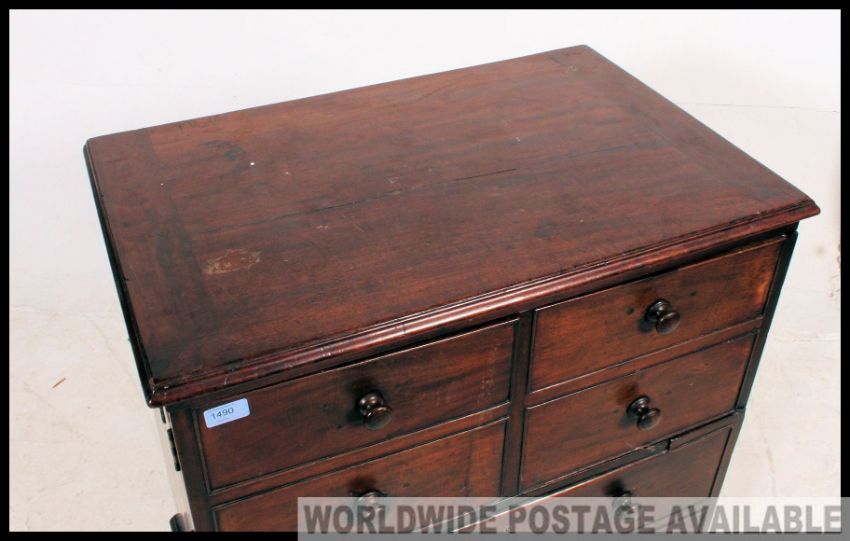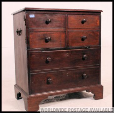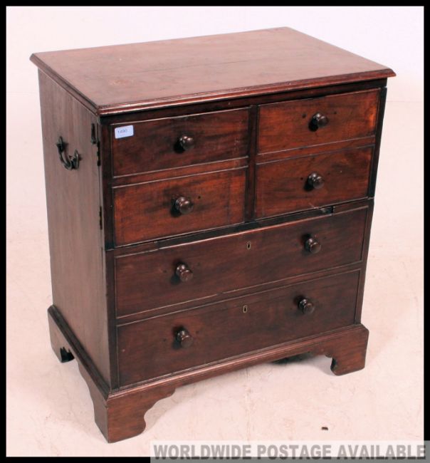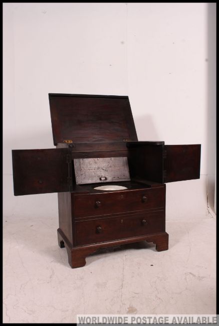 A 19th century Georgian mahogany commode / bachelors chest of drawers. Raised on bracket feet with faux chest of drawers front. The hinged top revealing a ceramic liner Measure: 80 x 70 x 46.