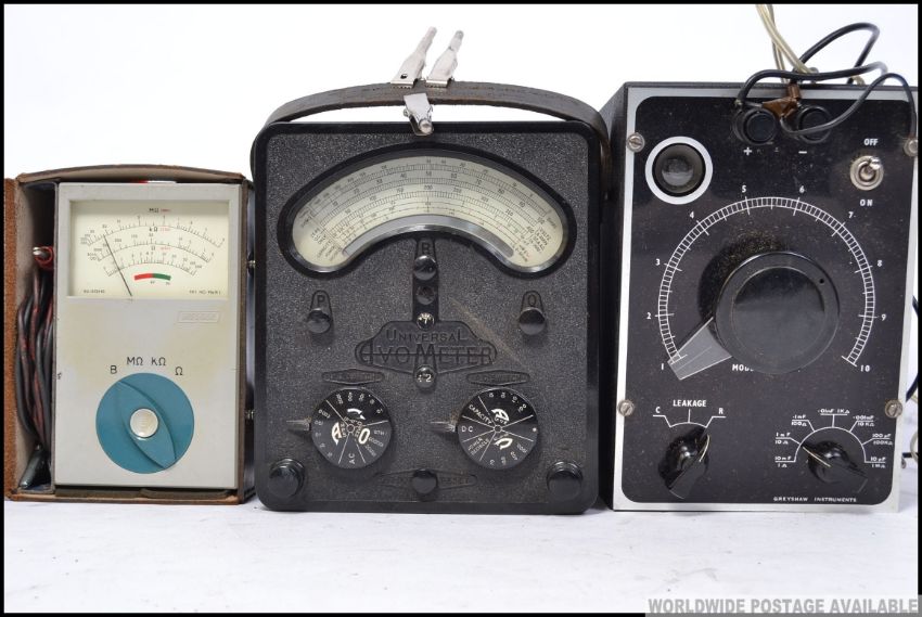 A Vintage leather cased Megger together with a Universal Avo Meter and a Model CR50 meter