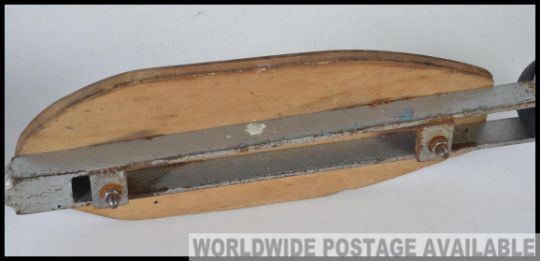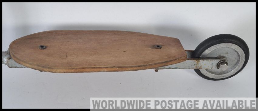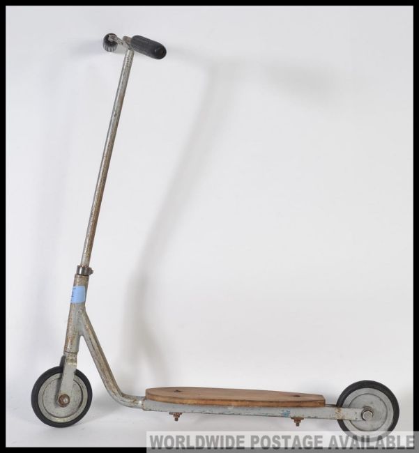 A vintage metal small childs scooter, having a metal frame construction with a wooden foot board H52cm