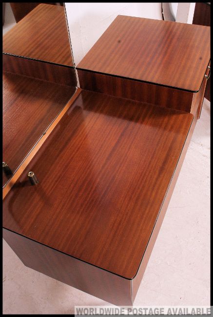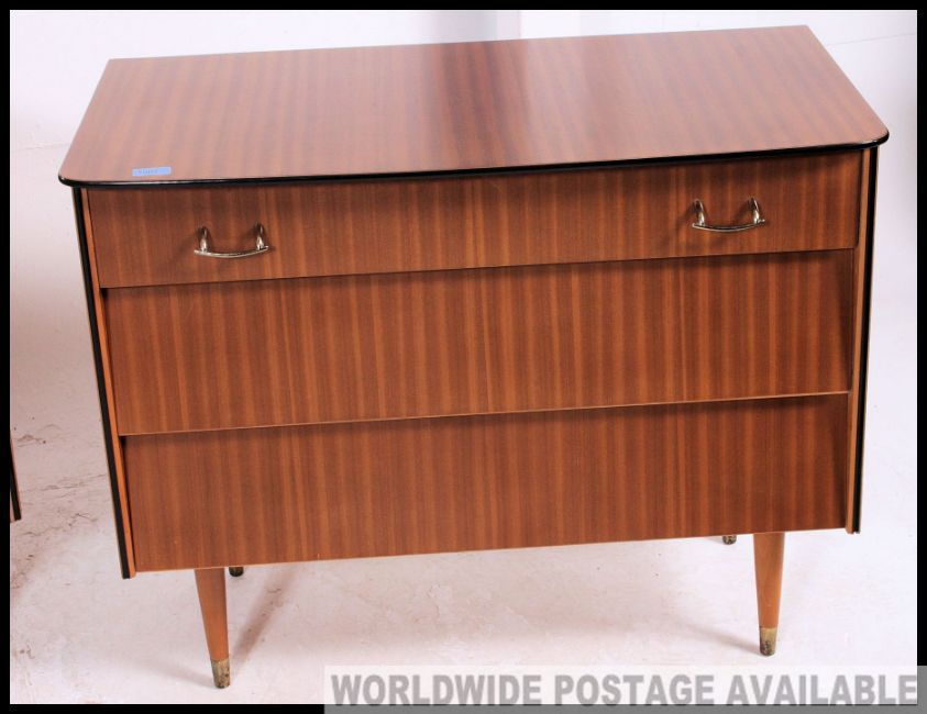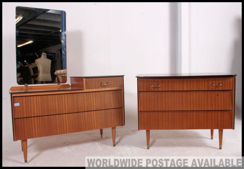 A retro 1950's Beehive teak wood chest of drawers raised on tapered legs together with a matching dressing chest of drawers with mirror atopfs Measures: 69 x 85 x 46.