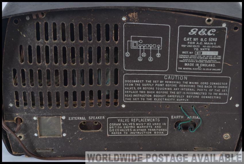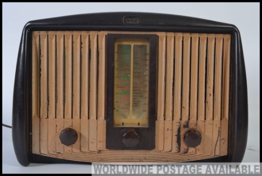 A vintage 20th century bakelite valve radio by GEC having shaped body with decorative facia