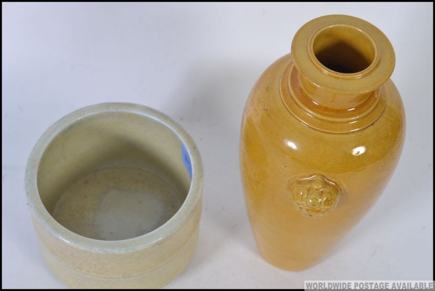 A Chinese monochrome yellow vase adorned with fu-dog masks and incised decoration of dragons and clouds. The underside with 6 blue character marks H22cm