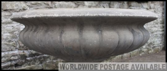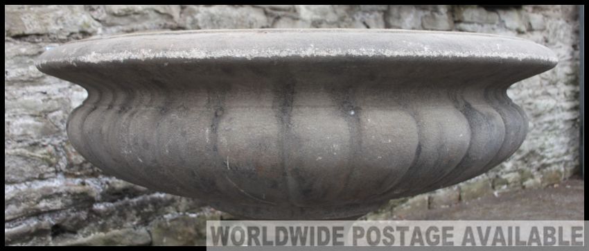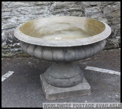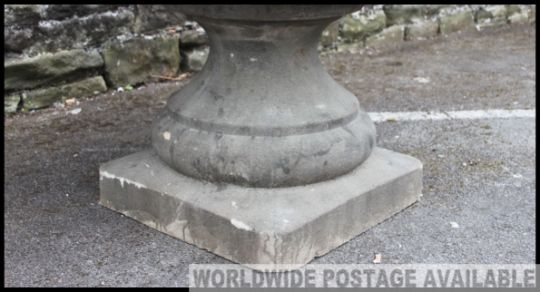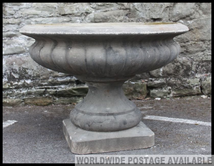 A fabulous large Campana urn - garden planter constructed of reconstituted stone having plinth base with a low and wide bowl top