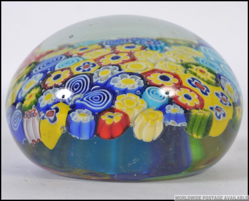 A large glass 20th Century paperweight with a central millefiori cane work panel in mixed colours W10cm