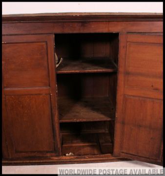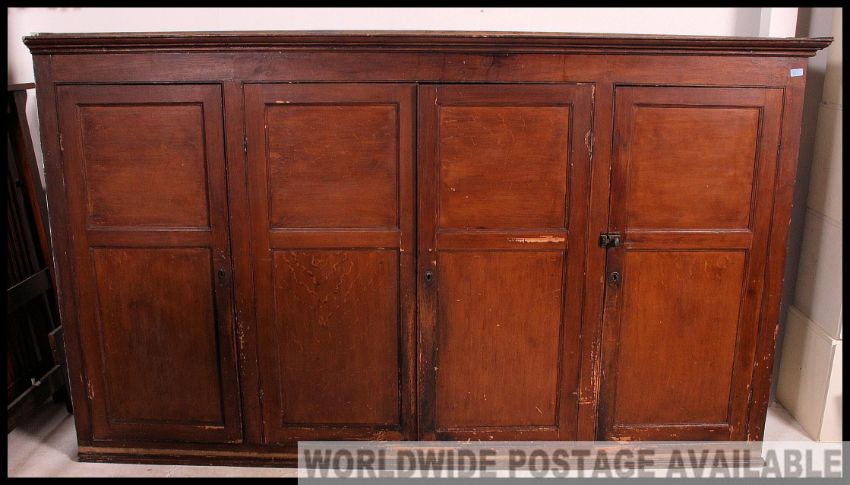 A stunning large 19th century pine estate / school cupboard. The upright deep body having fielded panel doors with flared top above. Enlosed, a series of shelves.