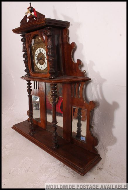 An unusual Edwardian mahogany overmantel mirror clock. The mirror back upright with central inset clock movement having swing pendulum