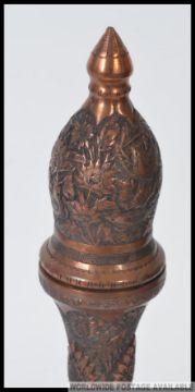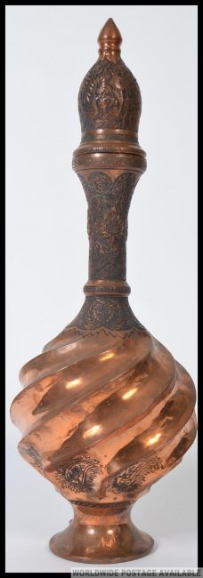 An Indian copper decorative twist design shaped bottle. Heavily engraved with various decorative motifs. H44cm
