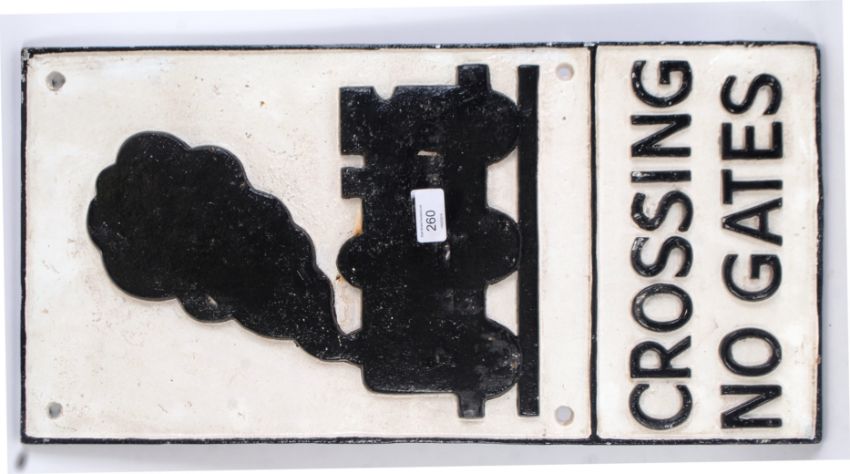 A large vintage style cast iron reproduction Railway Crossing sign. White, with raised black features. Screw holes to each corner.